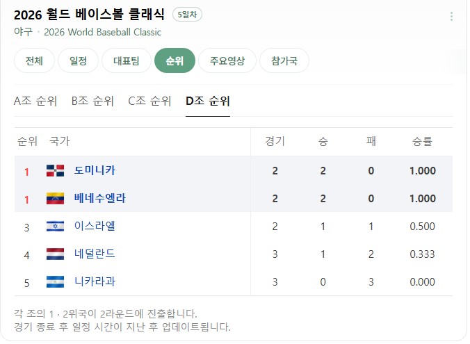 한국의 8강 상대는 D조 1위로, 현재 전승 가도를 달리고 있는 도미니카공화국 또는 베네수엘라가 유력한 상황입니다.